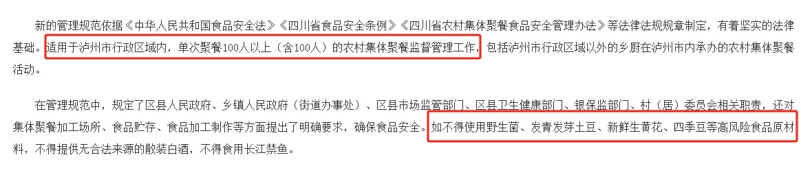 根据四川泸州发布的新版《泸州市农村集体聚餐食品安全管理规范》□◇△,其适用于泸州市行政区域内,监督管理工作,包括泸州市行政区域以外的乡厨在泸州市内承办的农村集体聚餐活动。