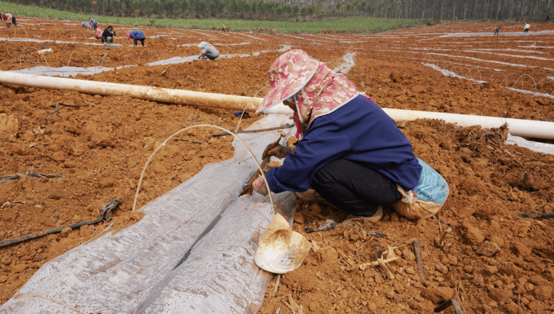 基地里,一垄垄新覆的地膜在阳光下泛着银光,工人们分散在田间,分工有序、动作熟练。他们有的手持工具整理田垄;有的弯腰点播南瓜子;还有的几人一组,默契配合,将地膜顺势拉平、覆土压实,为种子撑起一道保墒增温的屏障。目前,种植基地已全面开展播种工作。放眼望去,整齐的田垄向远处延伸,一粒粒种子正在春日的土壤中悄然扎根。